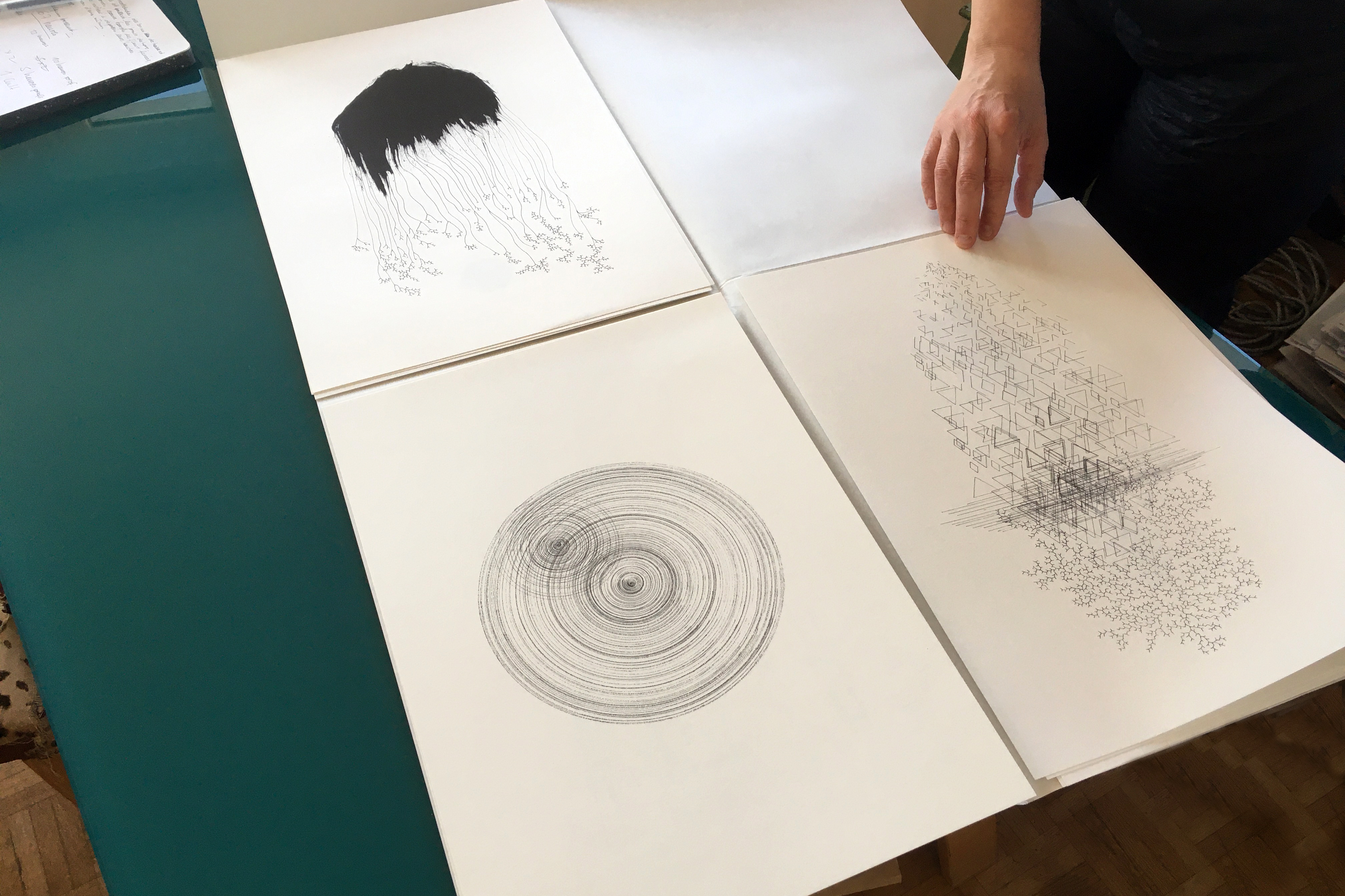 These drawings can be considered in any direction and in any temporality. It is possible to use one or more of them without respecting the order. They can be used as a start for an improvisation or as a tool to build the collective memory of a group of musicians, but a multitude of other uses are conceivable, these drawings do not constitute a "composition" but an "inspiration".