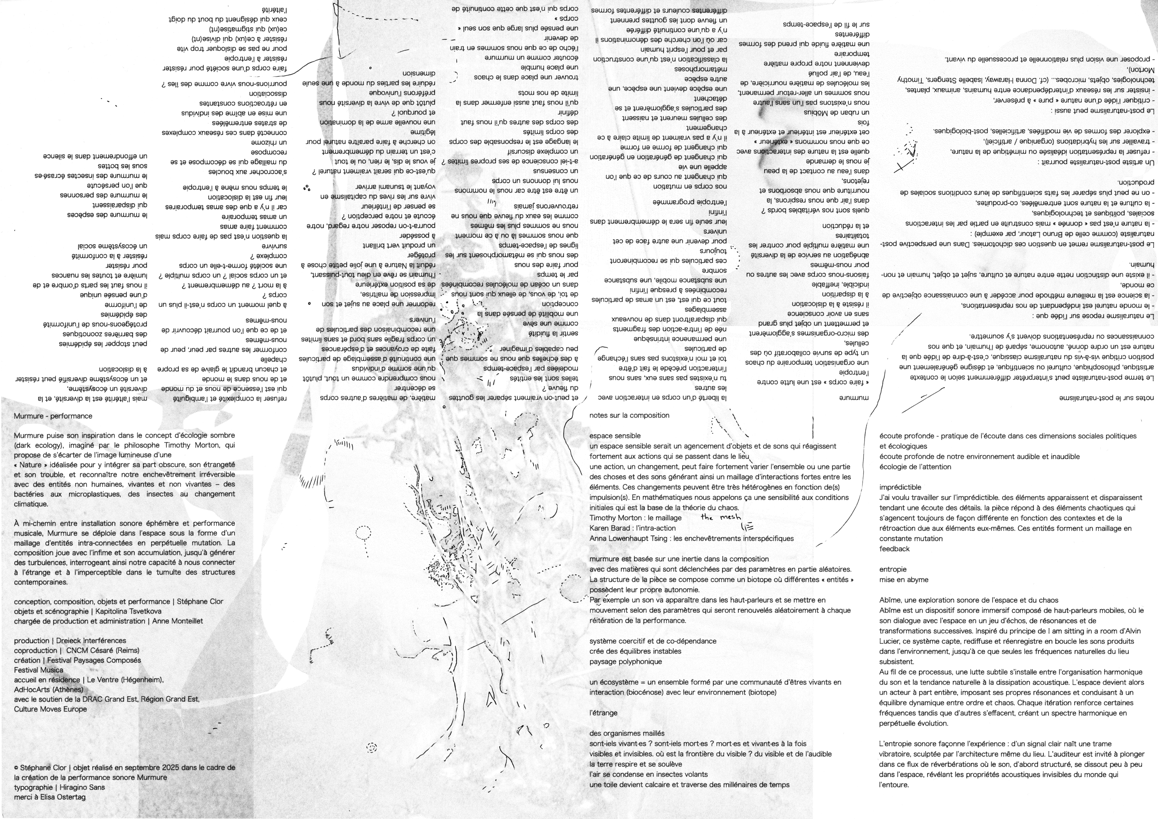 Murmure s’inspire de l’écologie sombre imaginée par le philosophe Timothy Morton, qui propose de s’écarter de l’image lumineuse d’une « Nature » idéalisée pour y intégrer sa part obscure, son étrangeté et son trouble, et reconnaître notre enchevêtrement irréversible avec des entités non humaines, vivantes et non vivantes – des bactéries aux microplastiques, des insectes au changement climatique.
